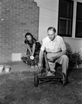 Mr. G. G. Taylor of 1009 Pafford, right, is shown doing yard work, enjoying his retirement after almost 35 years as a post-office clerk. With him is his wife, whom he married in 1922, in the office of the postmaster. Published in the evening edition, September 1, 1950.