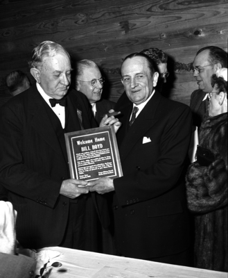 W. R. (Bill) Boyd Jr., right, holding a plaque presented to him on behalf of the Teague Citizens Council by Senator Connally at a banquet honoring the former president of the American Petroleum Institute.