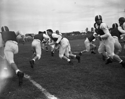 Texan Christian University's Dan Wilde, flashy quarterback from Graham, fakes a handoff to Keith Flowers and heads for the goal in a dummy scrimmage session at TCU. Published in Fort Worth Star-Telegram morning edition September 4, 1950.