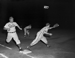 Ken Staples, Cat Catcher, lost this decision at first base in the first inning at La Grave Field, and a double play was chalked up against the Cats. Reaching for the ball is Houston's Jerry Witte, while Buff Pitcher Mary Garlock watches intently from mid-diamond. Umpire Bob Smith made the ruling on the close play. Published in Fort Worth Star-Telegram morning edition September 3, 1950.