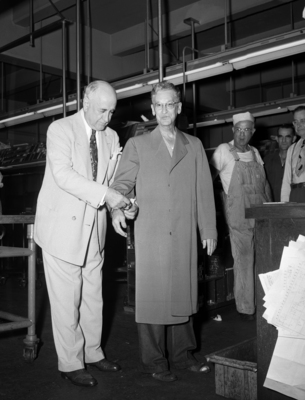 J. B. (Dinty) Moore celebrated his 70th birthday and his fellow printers remembered the occasion with a topcoat. This photo shows Amon Carter, left, helping Dinty adjust the sleeves.