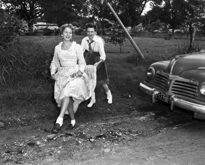 Centennial Queen, Betty Yarbrough, 19, left, a North Texas State College senior, is shown receiving assistance from Mrs. Poly Bezner, right, a southwestern princess in the "Progressorama," while crossing a mud puddle to take her place in the parade. Published in the morning edition, September 5, 1950.