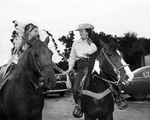 Miss Lola Lee Montgomery, right, a Denton Cowgirl, is shown next to Mrs. Robert Myers, left, of Gainesville. Mrs. Robert Myers is shown wearing a Native American headdress. The two women sit on horses, as prepare to ride in the opening parade for the Gainesville centennial celebration. Published in the evening edition, September 5, 1950.