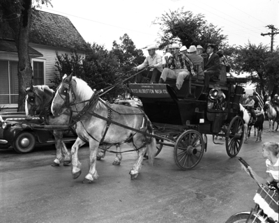 Image shows a double-decker carriage , that was built in 1889. The carriage carried Gainsville centennial officials and Congressman Ed Gossett, far right, during the Gainsville centennial parade. The carriage was used by President William McKinley in 1896. Published in the evening edition, September 5, 1950.