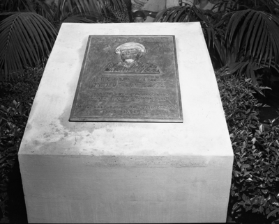 Image shows a bronze plaque, inscribed with the dedication of Frank Buck Memorial Zoo to the late wild animal hunter and Gainesville native. The image was taken during the Gainesville centennial celebration. Published in the evening edition, September 5, 1950.