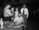 Two sets of fathers and daughters are shown signing the Crusade for Freedom scroll at a Labor Day picnic. The crusade was an American propaganda campaign with the public goal of raising funds for Radio Free Europe. Seated, is J. W. Paul, of 508 Youngblood Drive, standing, left to right, are C. L. Senior, a fireman; Miss Evelyn Howell, of 320 Whitney; Miss Janet Paul, and Mr. O. M. Howell. The signatures would be enshrined at the base of a Liberty Bell in Berlin. Published in the evening edition, September 4, 1950.