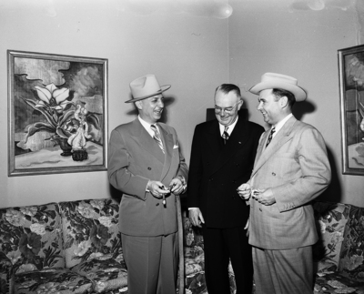 Paul Larson, left, departing Dallas district sales manager for Ford Motor Company and David Crandell, right, his successor, try out hats and belt and buckle sets presented by Russell Whatley, center, of Mineral Wells in the name of the district's dealers at River Crest Country Club.