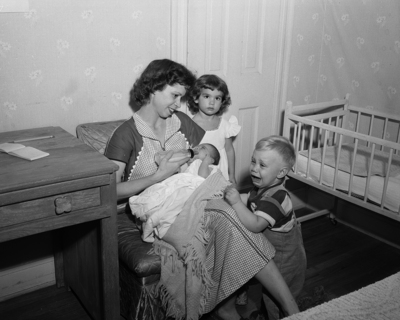 Mrs. William R. Mulvilhill is shown with her three children, 3-year-old Linda Carol, 2-week-old Janice Vianne, and 14-month-old Steven Roy. The family would return to their home at 3921 Mattison, to await word from Mr. Mulvilhill, who, ill with polio, had left for Seattle with his mother, Mrs. F. K. Follett. Mrs. Mulvilhill and children had been staying with friends at 3541 S. Henderson. Published in the evening edition, September 5, 1950.