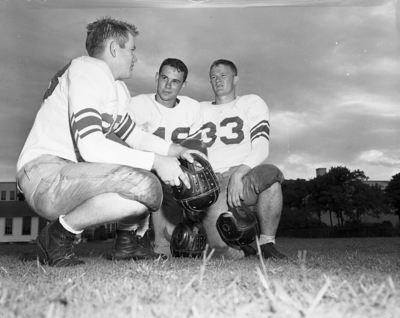 These three are the only returning lettermen on hand as Coach Bobby Sherrod prepares Amon Carter Riverside for the opening game September 15th, with Breckenridge. Left to right are Guard Steve West, Halfback Bill Chandler and Tackle Roland Maclin. Published in Fort Worth Star-Telegram evening edition September 5, 1950.