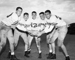 This quintet of rangy ends gives Amon Carter Riverside one of the most formidable pass catching departments in the City Conference. Left to right, David Anderton, 6-3; Joe Plemons, 6-0; Jerry Yates, 6-1; Roland Marcee, 6-3; and Eddie Chipman, 6-4. Published in Fort Worth Star-Telegram morning edition September 6, 1950.