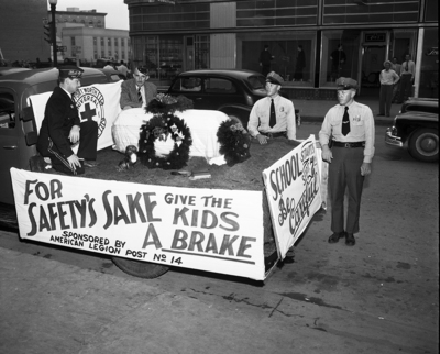Manning the dramatic float which toured Fort Worth earlier in the week during a back-to-school safety program were, left to right, Raymond Bertholf, Allen Black, H. H. Hungerford, and J. A. Larson. Hungerford and Larson escorted the float on their motorcycles. Published in the evening edition, September 5, 1950.