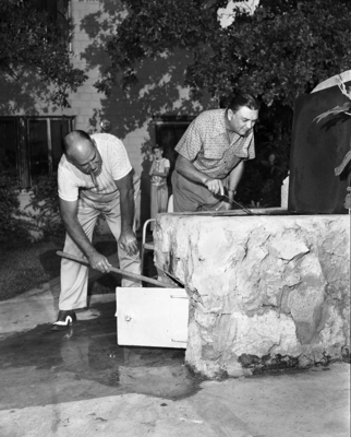 Dr. R. H. W. Drechsel, left and Ed T. Bagaley, whose wives are sisters and whose houses are on the same lot at 4300 Kenwood Court, where had lived for 18 years. The two families frequently played hosts to their neighbors with picnics and barbecues in their large yard. Published in the morning edition, September 10, 1950.
