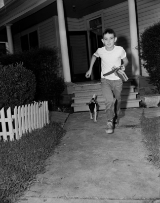 Image in a series on Gene McGarrey during a school day. The young boy is shown in the morning, as he heads off to school. On his left he is followed by a small dog. Published in the morning edition, September 6, 1950.