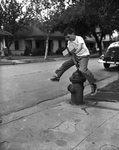 Image in a series on Gene McGarrey during a school day. The young boy is shown leaping over a fire hydrant as he heads to school. Published in the morning edition, September 6, 1950.