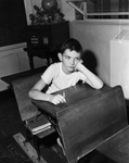 Image in a series on Gene McGarrey during a school day. The young boy is shown sitting at a desk at school. Published in the morning edition, September 6, 1950.