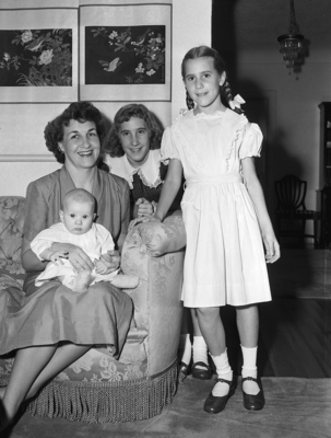 Mrs. J. Gordon Russell, and children, are pictured here. They are William, the baby, Maud, center, and Ruth, right. The had moved here recently with Colonel Russell, who was stationed at Carswell Air Base.