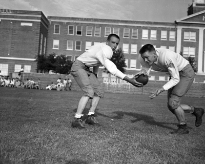 Quarterback Eddie Horton hands ball off to Left Halfback Ed Nowland, who is expected to be the heavy duty performer in Poly's T-formation attack this season. Both are returning numeral winners. Published in Fort Worth Star-Telegram evening edition September 6, 1950.