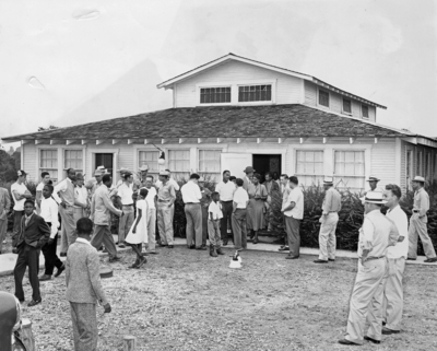 Clipping reads: "A crowd mills around the Euless Independent School after a group of Negroes attempted to enroll their children there. The Negro children were refused. Their leader [Dr. G. D. Flemmings of the Fort Worth branch of the National Association for the Advancement of Colored People (NAACP)] said later they had not expected to gain admission, but hoped to get improvements for the Negro school...Flemmings added that 'the courts have ruled that the Negro children of the Mosier Valley community must be given equal school facilities--that building is in bad condition and we wanted the school board out there to do something about remodeling it.'"