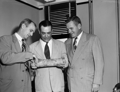 Inspecting a core cut from one of its wildcats are these geologists of the Gulf Oil Corporation's Fort Worth division, who recently were promoted to assistant division geological supervisors. Left to right: J. R. Crump, P. A. Grant and H. Y. McClure. Published in Fort Worth Star-Telegram morning edition September 10, 1950.