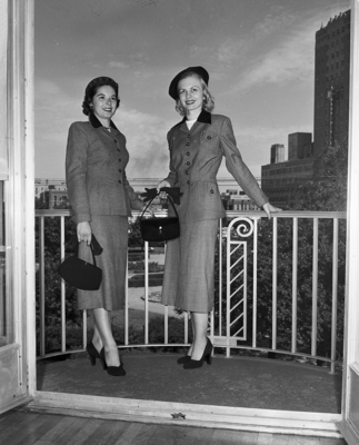 Mrs. O. J. Butts Junior, and Mrs. Joe D. Horn modeled fall fashions in the style show presented by Meacham's at the Junior Woman's Club luncheon at the Woman's Club. Mrs. Butts wears a trim Junior Deb gray flannel suit trimmed with plum velvet collar. Mrs. Horn's suit by Kraus is of gray menswear worsted with black velvet trim. Published in Fort Worth Star-Telegram morning edition September 7, 1950.