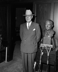 Photograph of Charles Stillwell, Lubbock, dressed neatly in a suit and hat standing right next to a sculpture.