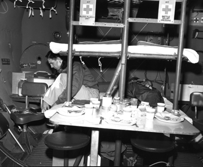 A dining room is the latest addition to that home-away-from-home for airmen, the B-36, and new in-flight meals are almost like the ones mom used to cook. At left, Captain W. H. Adams, navigator, piles up sack time while Captain C. V. Wunderlich, airplane commander, gets dressed for a midnight ham-and-eggs breakfast in the aft compartment. Published in Fort Worth Star-Telegram morning edition, September 10, 1950.