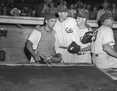 Manager-Catcher Bobby Bragan, left; Pitcher Pat McGlothin, center, and shortstop Russ Rose of the Fort Worth Cats who'll meet the Tulsa Oilers at La Grave Field in first game of Texas League Playoff. Published in Fort Worth Star-Telegram evening edition September 11, 1950.