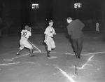 what looks like a fancy dance maneuver by Dallas' Lou Morton and Umpire Allen (Andy) Andrews is really what came naturally in the Eagle-Cat baseball game. Scoring gave Lou that "gone" expression, Andy's just getting out of the way. Published in Fort Worth Star-Telegram evening edition September 9, 1950.