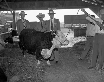 Fred DeMalade, Chester Hollis and Oscar Vogel are pictured here from left to right, with the grand champion bull, Real Plus 4th owned by M. D. Willhite of Wilmer.