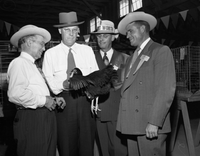 J. E. Swanson holds his Rhode Island Red pullet which was judged grand champion female of the poultry show. Looking on are Fort Worthers J. W. Hoskins, J. L. Bigler and Joe Prigmore.