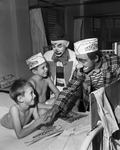 Clowns from the Hadacol Good Will Caravan entertained polio patients in City-County Hospital's isolation ward. Daniel Richard Martin Jr., left, and Melvin Douglas Chasteen meet Bill and Bozo.