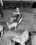 Seven boxers against one sparring partner can keep you busy but for six-year-old Howie Glick, it's all in a day's play. The seven puppies are of a litter of 12. Jazabel, the mother belongs to Howie who is the son of Mr. and Mrs. H. L. Glick of 4017 Marks Plane. Published in Fort Worth Star-Telegram evening edition September 7, 1950.