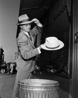 Appropriately observing "Felt Hat Day" is Jerry Smith, 5321 Locke, shown discarding his straw in favor of new felt headgear. Published in Fort Worth Star-Telegram evening edition September 8, 1950.