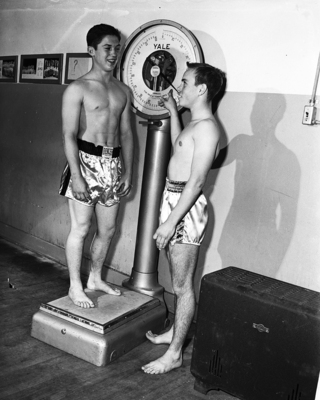 High School Welter Billy Spruill of North Side (Pointing to scales) and Poly's Maurice Etheridge met at Will Rogers Memorial Coliseum in the first bout of the 1950 regional Golden Gloves tournament. Maurice Etheridge stands on the scale while Spruill points towards it. Published in the Fort Worth Star-Telegram evening edition, January 19, 1950.