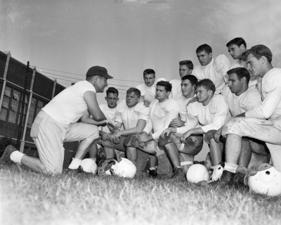 Coach Bill Allen of Paschal looks over his starting lineup. Left to right, front, are end Lee Talor, Tackle Gary Perkins, Guard Bob Alderson, Center Ralph Martin, Guard Dixon Holman, Tackle Jim Hanrahan and End. Frank Hopkins. Rear, Halfback Weldon Burt, Fullback Robert Towery, Quarterback Bobby Hughes and Halfback Walter Hamilton. Published in Fort Worth Star-Telegram evening edition September 7, 1950.