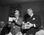 Pictured here is William M. Massie, whose 60th anniversary with the Fort Worth National Bank was observed at River Crest Country Club, was presented a television receiver "to keep him home night." He's holding a model of the set.