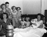 Deborah, 10-day old daughter of Mr. and Mrs. Ira Bratcher, who live near Handley, wails lustily as she poses with her mother and her brother, Leroy, 13, and six sisters. Deborah was born here in an auto that was carrying her mother to a hospital. Sisters, left to right, are Jeanette, 17, Pauline, 15, Priscilla, 11, Alene, 10, Norma Jean, 6, and Bobbie Ann, 5. Leroy is the only brother.
