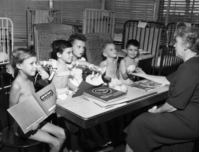 Smiles and awe were mingled in these 6-year-old polio patients' faces as Mrs. Zettie Ord started their own first grade class at City-County Hospital. Left to right are Lola Dethloff, Mike Stacy, Johnny Lightfoot, Wayne Pound, and Mike Ward, the diplomat who is presenting an apple to Mrs. Ord.