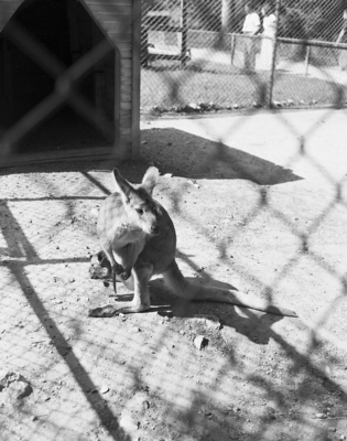 Poking its head from mama's pouch, the tiny Walaroo kangaroo at Forest Park Zoo survey the cruel, cruel world and decides the pouch is not bad after all. But when baby gets a little bigger, mama kangaroo will evict it. The whole family are favorites with young and old visitors at the zoo. Published in Fort Worth Star-Telegram evening edition September 15, 1950.