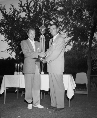 Jim Simpson (left) receives trophy from President Lacy Bogess of Colonial after winning the annual club golf title with a 72-hole score of 298. Two men are shaking hands smiling holding a trophy. Published in Fort Worth Star-Telegram morning edition, September 10, 1950.