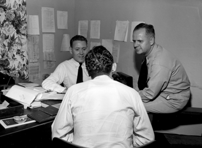 A patient entering the USPHS psychiatric hospital is assigned to a psychiatrist, such as Dr. M. E. DeBolt, left. But for every important decision - diagnosis, treatment, change of treatment - the assigned psychiatrist has the aid of a senior psychiatrist, such as Dr. E. W. Green, right, clinical director. Published in the Fort Worth Star-Telegram morning edition, January 23, 1950.