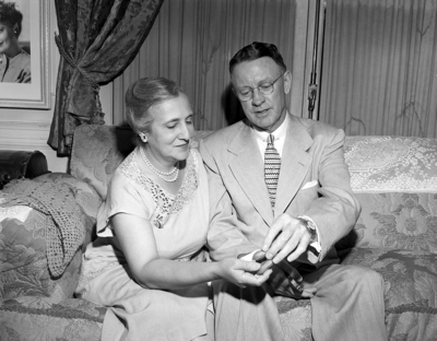 Pictured here is Fred Gurley, president of the Atchison, Topeka & Santa Fe Railroad, and Mrs. Gurley relaxed at the Fort Worth Club after he had inspected the Santa Fe shops in Cleburne