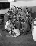 Pictured here are Lake Worth Emergency Corps members are shown at a first aid class. C. D. Hoeflin is applying artificial respiration to Boone Blakely. The instructor is Eddie Fulkerson, in the white T-shirt.