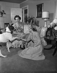 Pictured here is Mrs. Frances Marjorie Anderson, wife of Major General Anderson, commanding officer of the 8th Air Force, feeding sugar to the pointer, Butch, while her daughter, Ellen, shakes the dog's paw. The portrait behind them is of General Anderson.