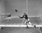 Posed action shot of sophomore Teddy Vaught from Lubbock, one of the nine ends on the Texas Christian University varsity squad this fall, demonstrates finger-tip control of the spiraling football. It is with passes that the Frogs hope to spark their attack. Vaught is one of six young wingmen showing early season promises. Published in Fort Worth Star-Telegram evening September 20, 1950.