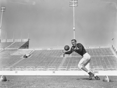 Posed action shot of Wayne Martin of Texas Christian University. In the middle of a pass-catching exercise. Published in Fort Worth Star-Telegram evening edition October 3, 1950.