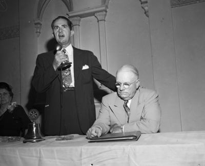 "He has been one of the best committee chairmen we have ever had in Texas," Governor Allan Shivers, at the microphone, said at the state Democratic convention in Mineral Wells in paying tribute to John C. Calhoun of Corsicana, retiring executive committee head, seated.