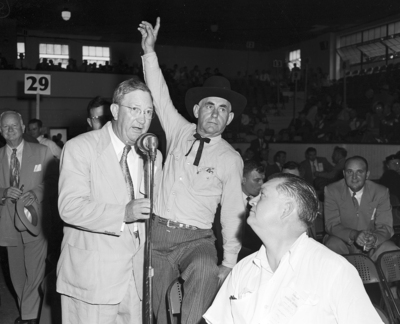 Arch Rowan, chairman of the Tarrant County delegation, delivers the delegation's votes to the convention. Deputy Sheriff Jack Chapman of Gordon is standing next to him on the right with his arm raised.