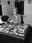 Mrs. Charles C. Miller, secretary of Hemphill Presbyterian Church, is seated at her desk which is covered with photos of young acquaintances she has helped in her years of service as supervisor of young people's work.