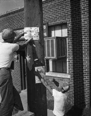 Among city street department crews that have been busy tearing down political candidates' campaign signs from utility poles are Loyd Lemons, left, and Darrel Collins, who found these three unlawful signs on a post at E. 7th and Jones.